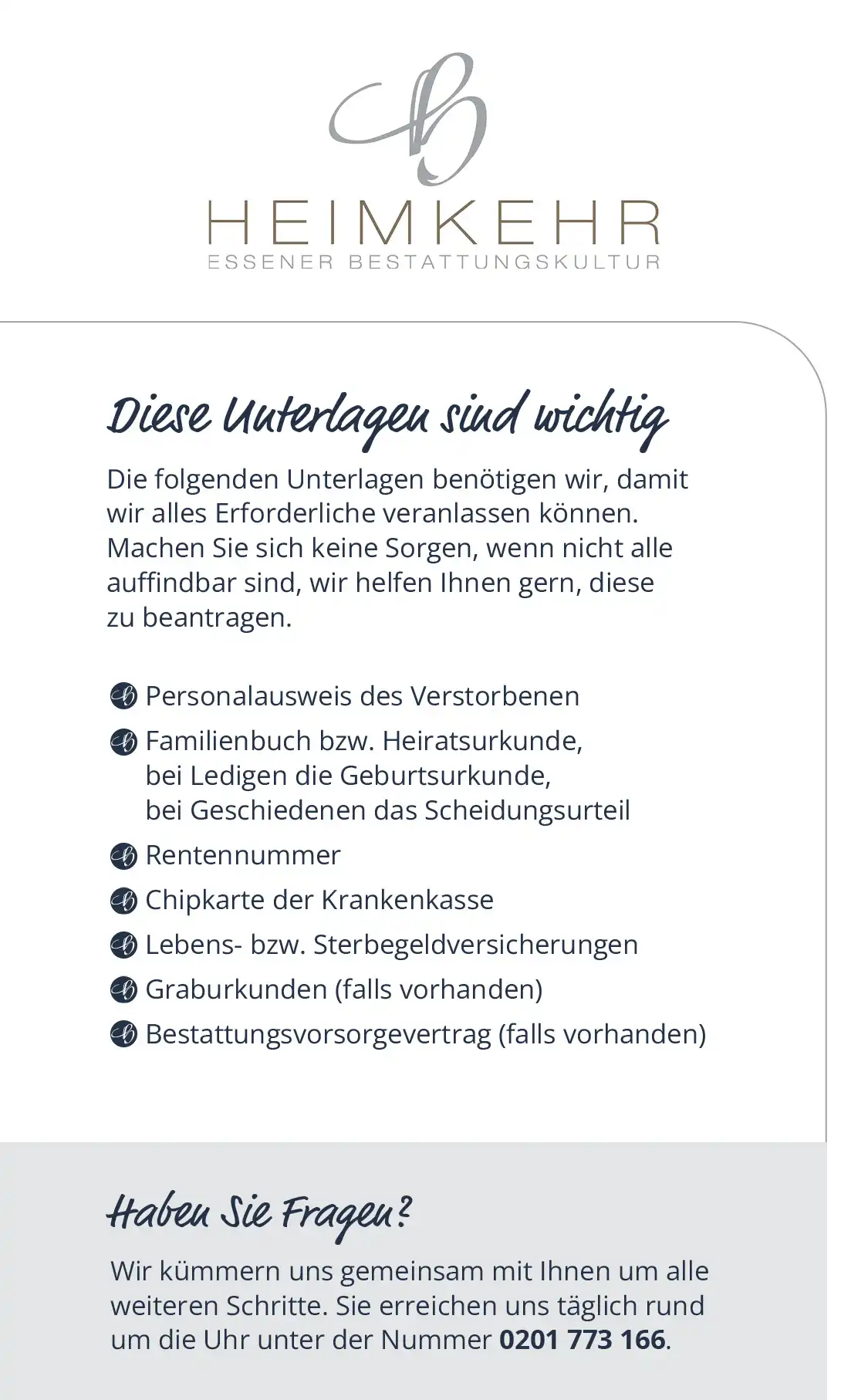 Unser aufrichtiger Dank gilt dem Team von Heimkehr für die äußerst einfühlsame Begleitung, die hohe Professionalität und die bemerkenswerte Flexibilität.